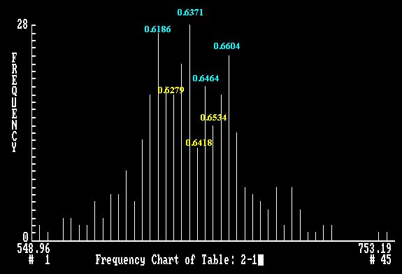 Monthly Cycle Frequency Chart of Australian Dollar The frequency is a quantified value assigned to each bar. The difference in frequency of two adjacent bars indicates the ease with which the market is expected to move between these two points. The smaller the difference, the easier the movement.